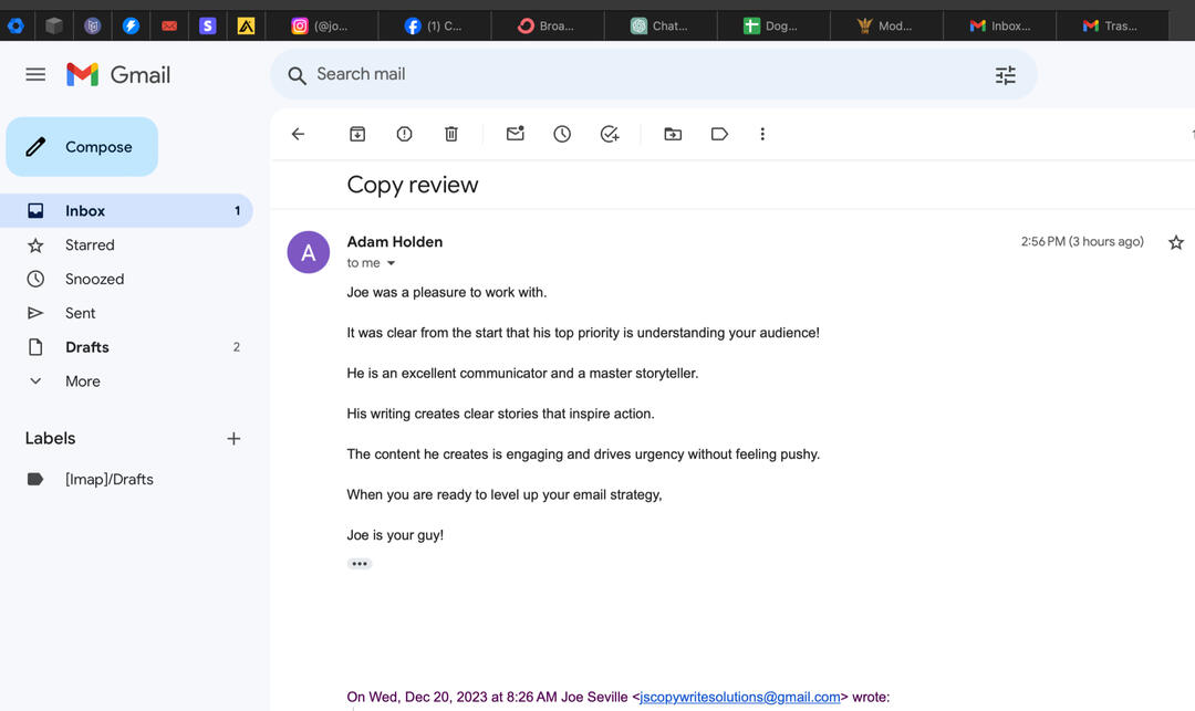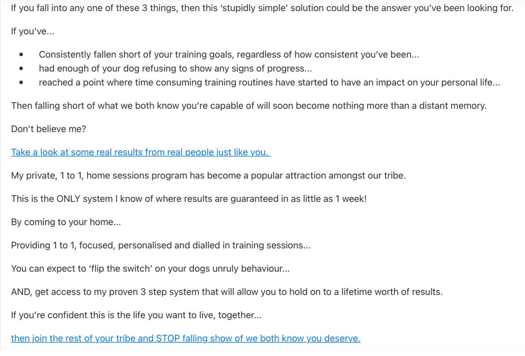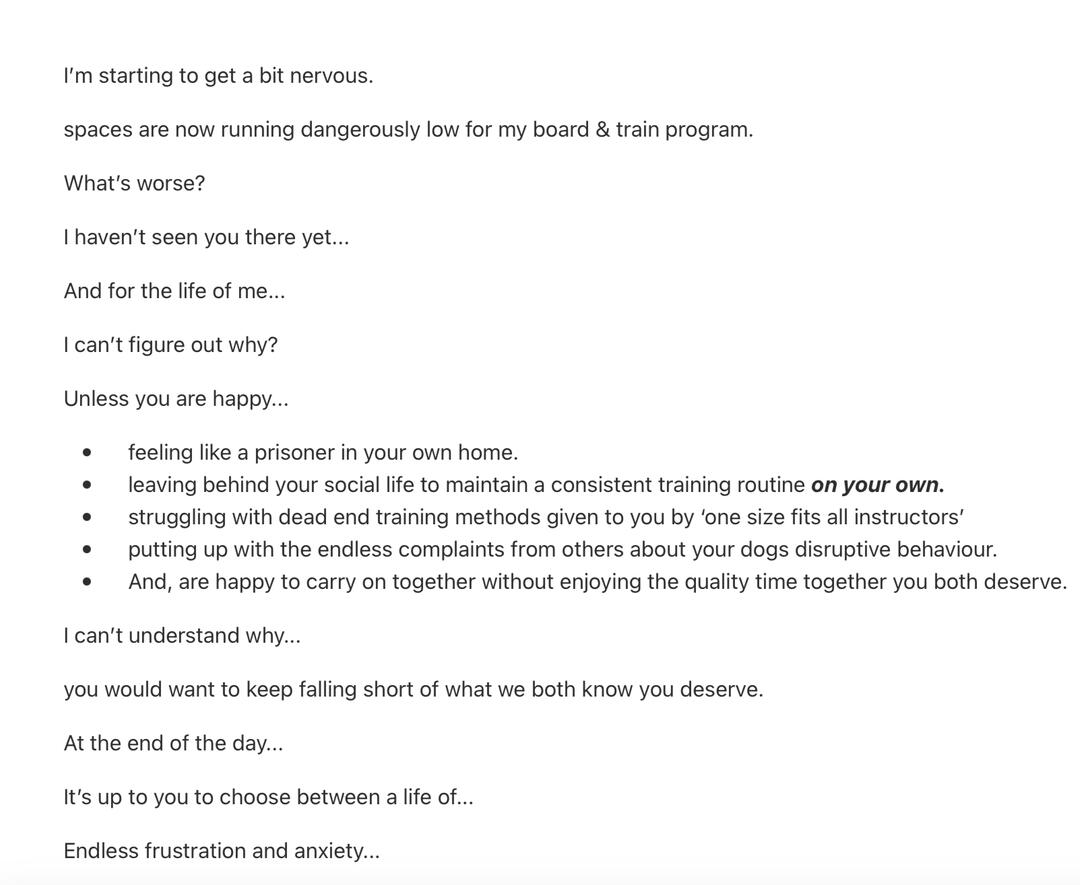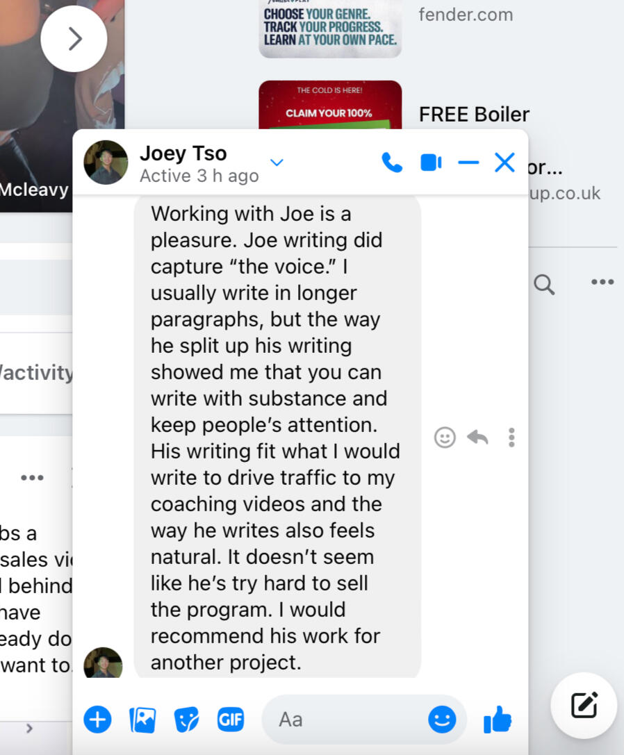 Where do I start?Never got on at school...Thought I knew it all.Left college early...Thought it knew it all.Went and got a job.Turns out, I don’t know it all.So...I had to start again.This is when I learn’t how to write copy for business owners...And,Help them profit massively through email copywriting.I guarantee that every email I send will go straight to the primary tab...And, aim to double your revenue in the process.Email marketing has helped industry giants like Grant Cardone, Tai Lopez and Biotrust...Dominate their industry.And guess who taught me how to write?The two copywriters responsible for taking them there.Anyway, that's just a bit about me and what I can do for you.