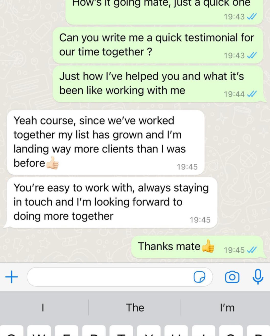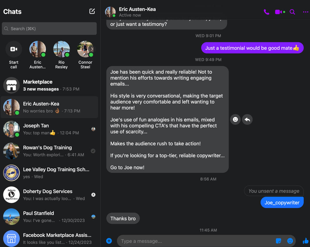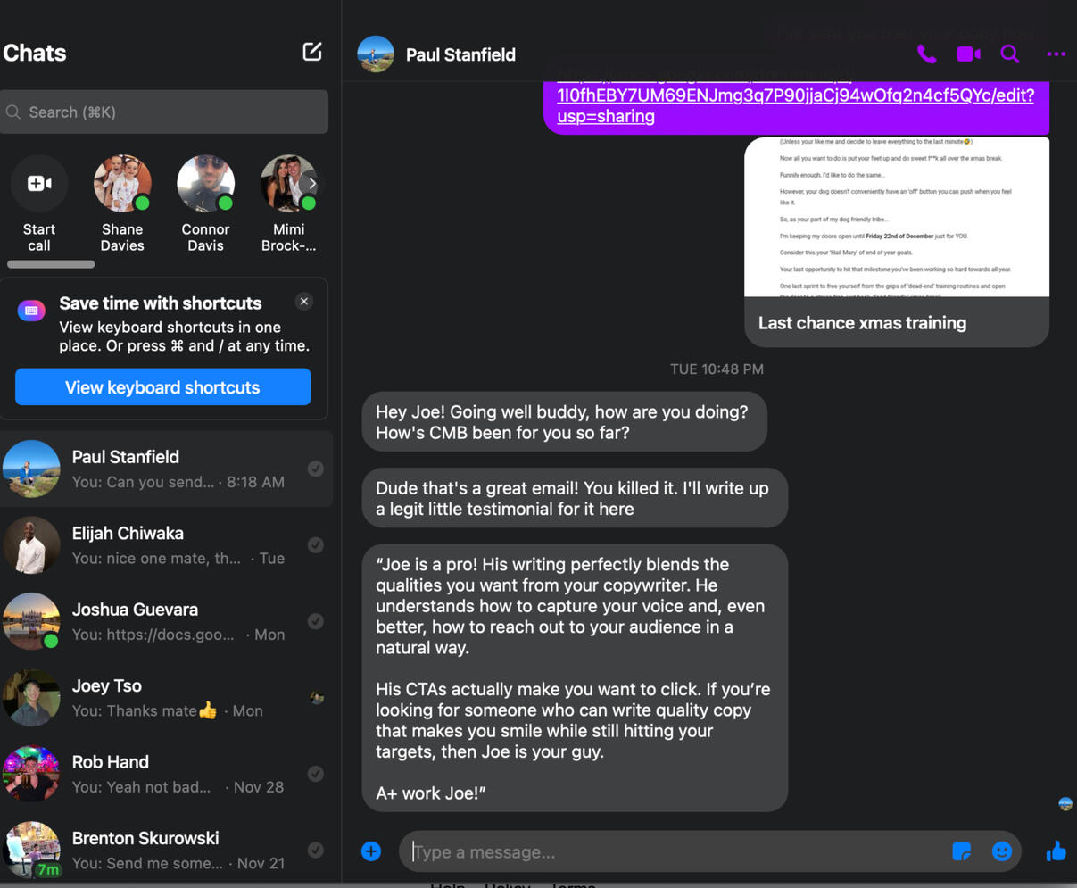 Where do I start?Never got on at school...Thought I knew it all.Left college early...Thought it knew it all.Went and got a job.Turns out, I don’t know it all.So...I had to start again.This is when I learn’t how to write copy for business owners...And,Help them profit massively through email copywriting.I guarantee that every email I send will go straight to the primary tab...And, aim to double your revenue in the process.Email marketing has helped industry giants like Grant Cardone, Tai Lopez and Biotrust...Dominate their industry.And guess who taught me how to write?The two copywriters responsible for taking them there.Anyway, that's just a bit about me and what I can do for you.